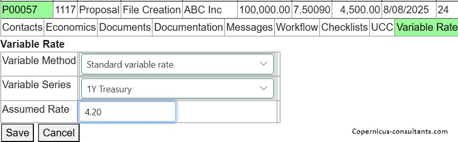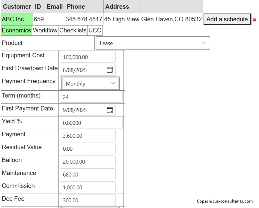 The standard financial products in Copernicus are Hire Purchase (conditional sale in the USA), finance leases, loans, operating leases, project finance and block funding. These are highly configurable and new products based on these basic types may be created by users. Furthermore, the use of “schemes” enables constraints to be laid on top of the standard product features. For example, default values for Yield required or document or other fees. Copernicus has optional project finance and construction period options enabling the build out of an asset before it becomes a lease at “term out”. Interest may be charged during this period or rolled up to the lease start date. Contracts may be fixed or variable rate and optional services such as maintenance or insurance may be included in any of the products