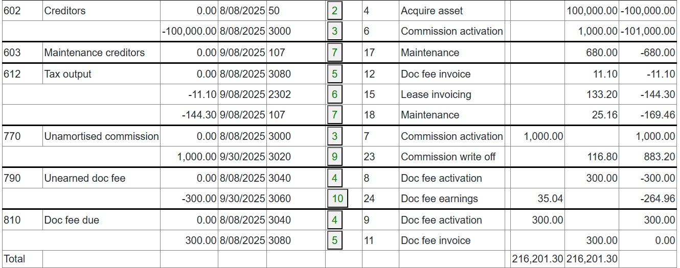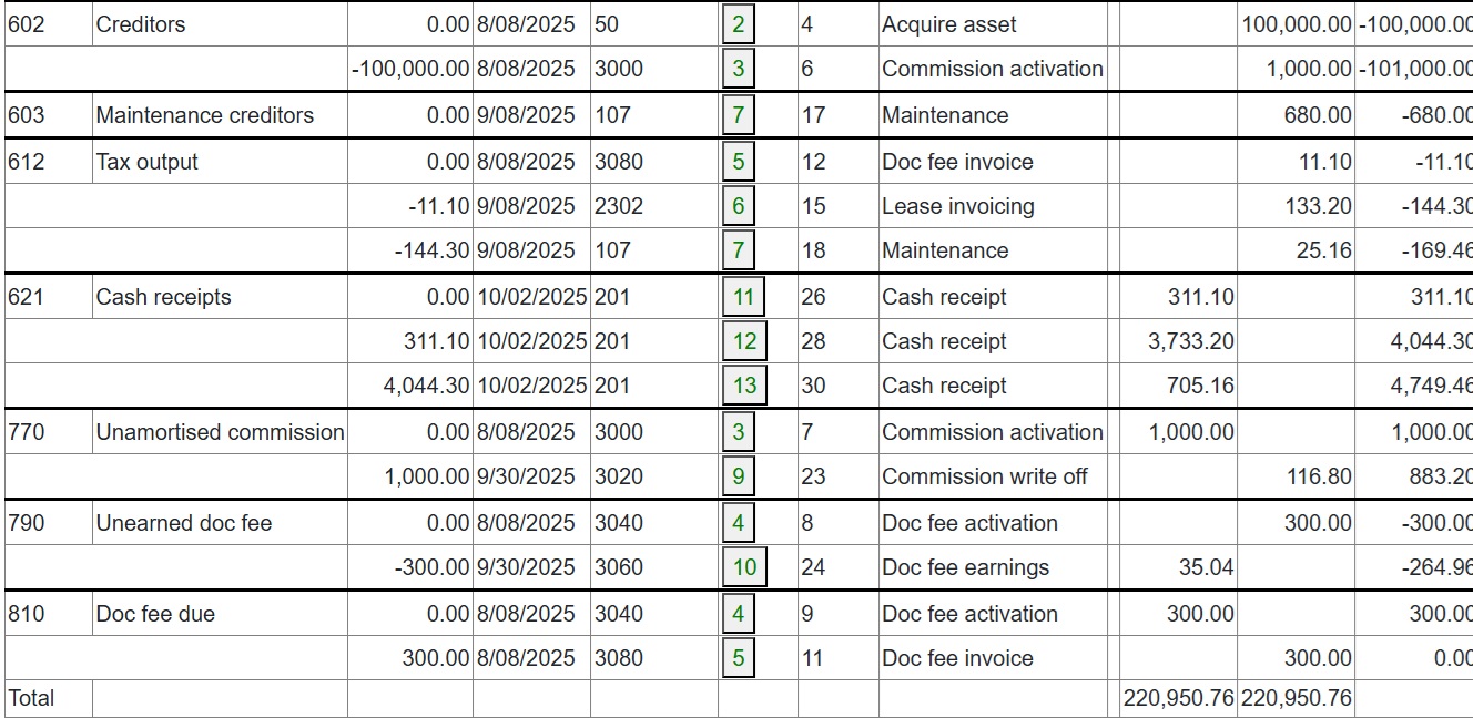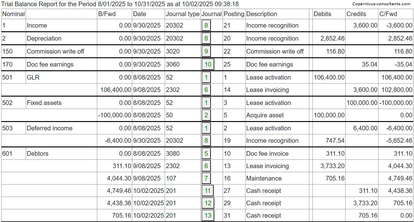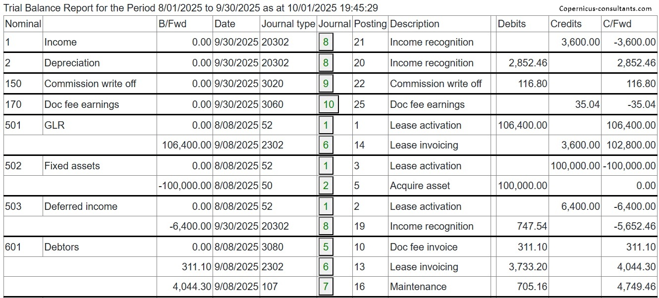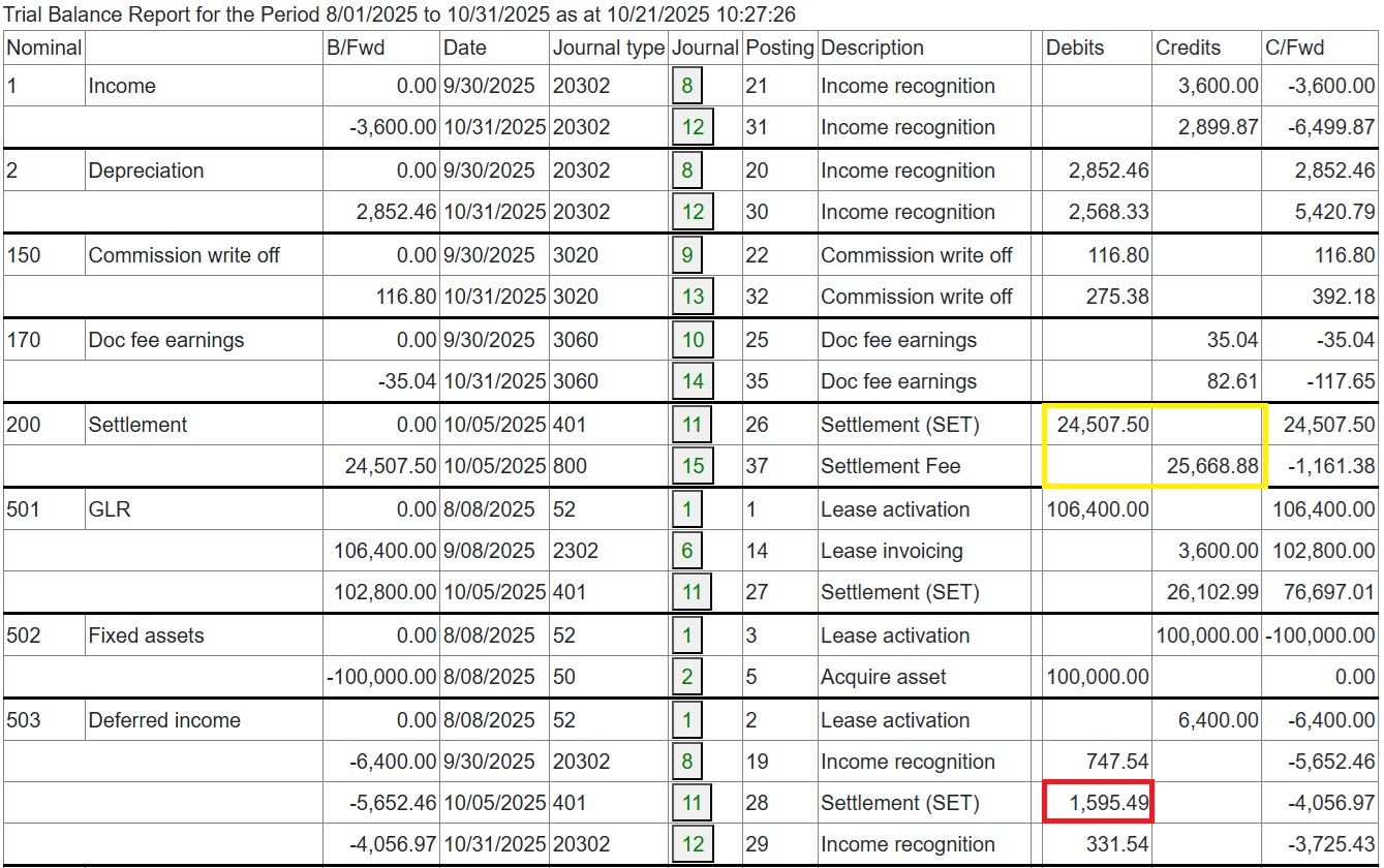Full and partial settlements (payoffs). Copernicus enables a Quote (with expiry date) and Process (within expiry date) approach to settlements. Settlements can also be reversed using the “Undo” option. Below is a detailed example of a partial settlement. It is based on 4 assets each costing 25,000 with balloons of 5,000, 5,000, 0 and 10,000. As you can see the balloons are not simply a prorata of the total baloon of 20,000 for assets 3 and 4. if we settle one of the first 2 assets then we would expect the payment reduction to be 25% of the total payment of 3,600. This is how the Trial Balance (TB) looks after processing Aug and Sep 2025
