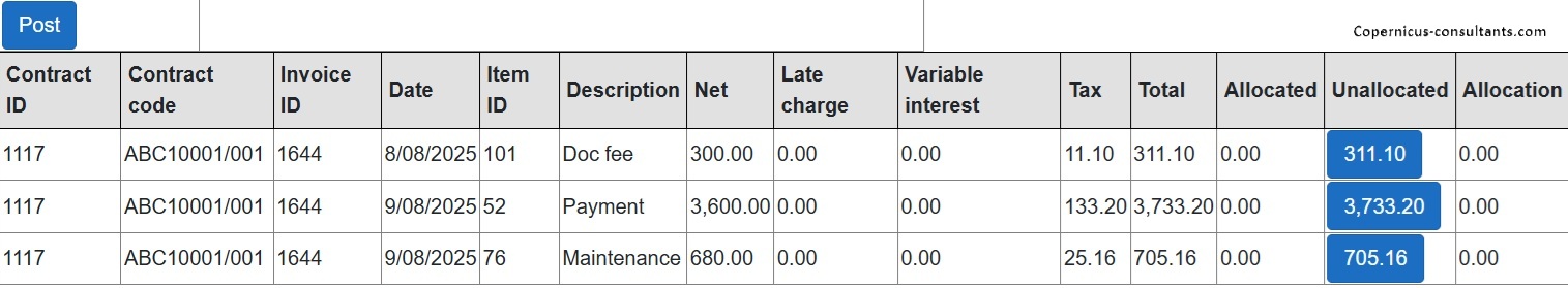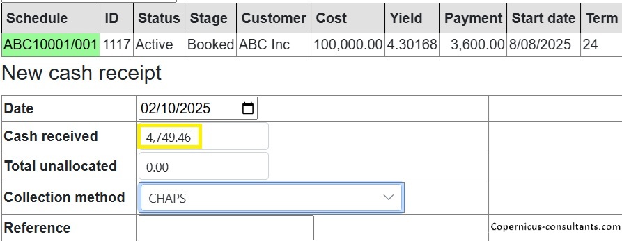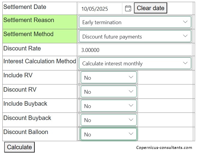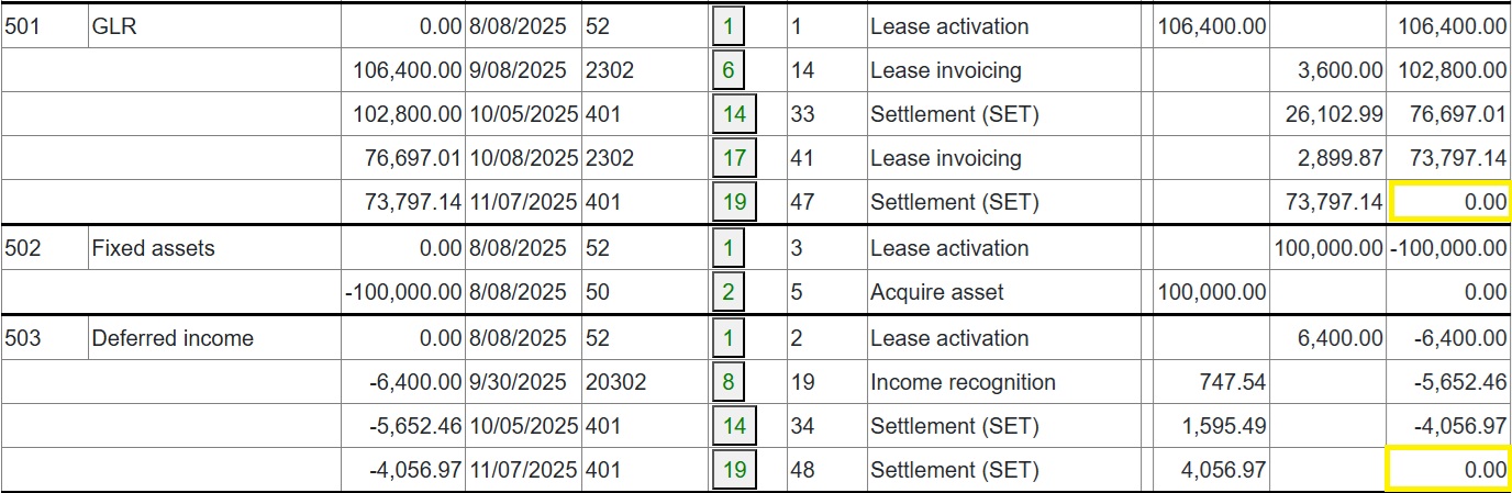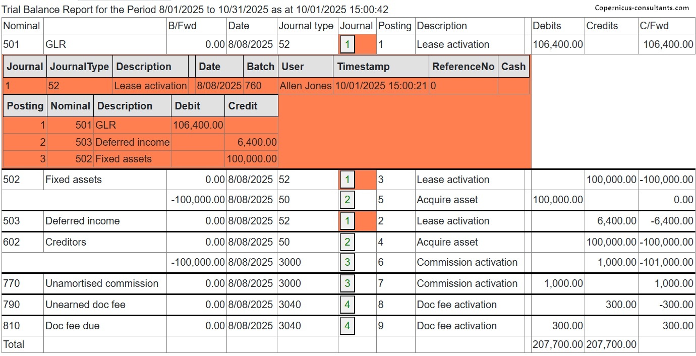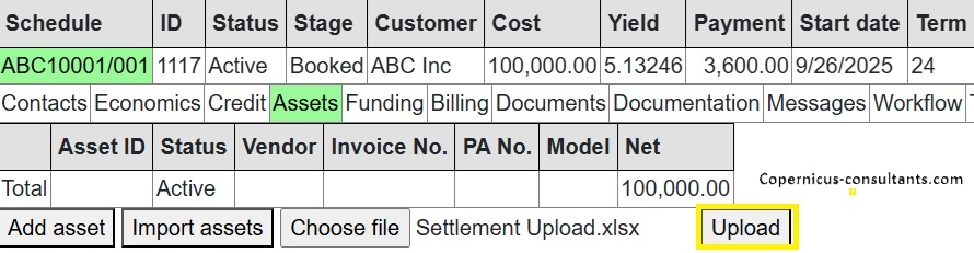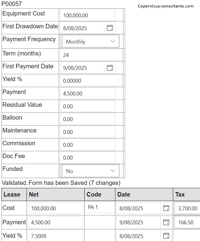 Full and partial settlements (payoffs). Copernicus enables a Quote (with expiry date) and Process (within expiry date) approach to settlements. Settlements can also be reversed using the “Undo” option. Below is a detailed example of a partial settlement. It is based on 4 assets each costing 25,000 with balloons of 5,000, 5,000, 0 and 10,000. As you can see the balloons are not simply a prorata of the total baloon of 20,000 for assets 3 and 4. if we settle one of the first 2 assets then we would expect the payment reduction to be 25% of the total payment of 3,600. This is how the Trial Balance (TB) looks after processing Aug and Sep 2025