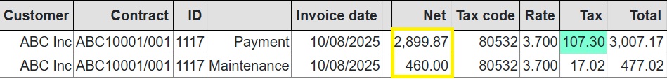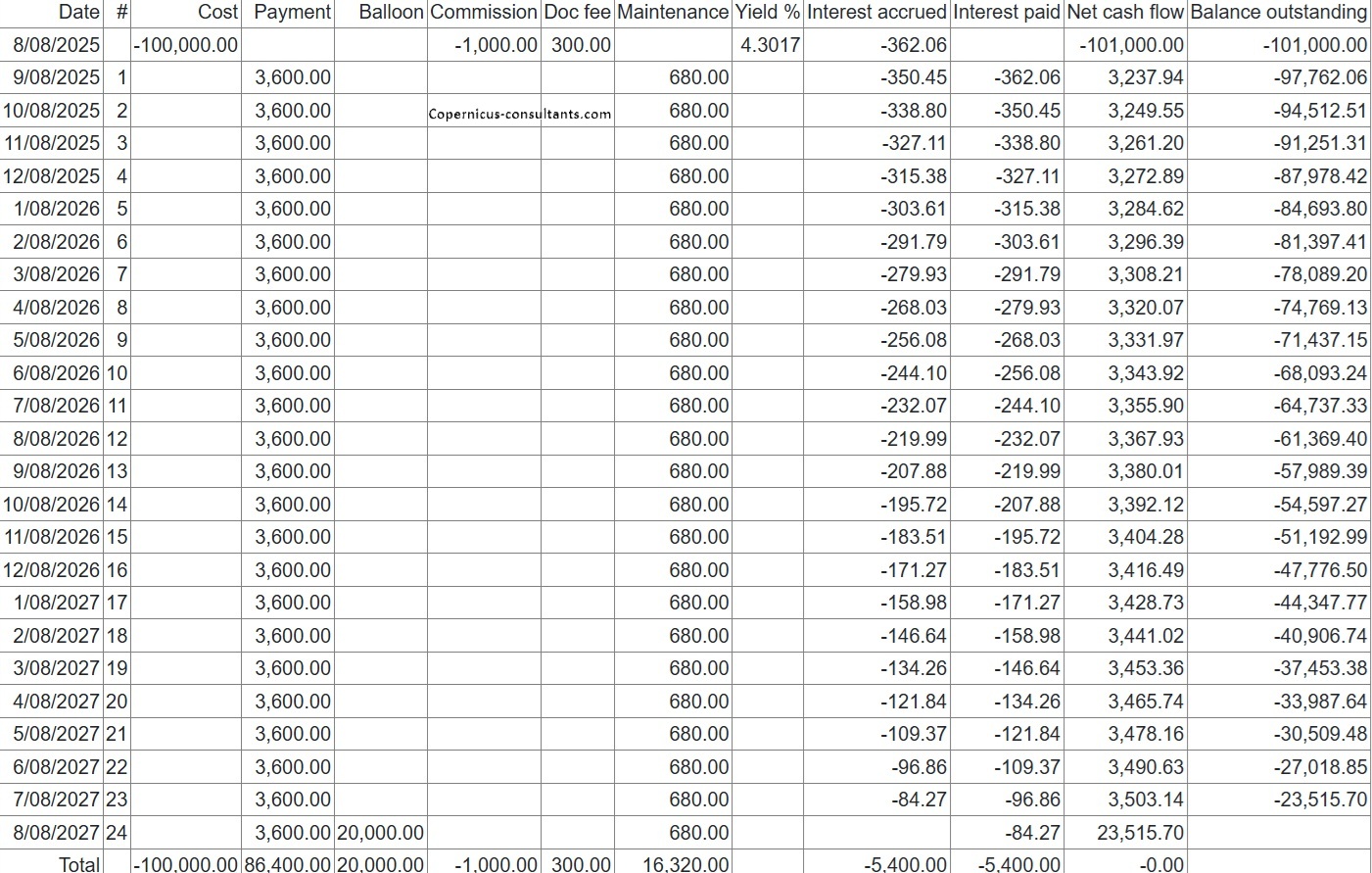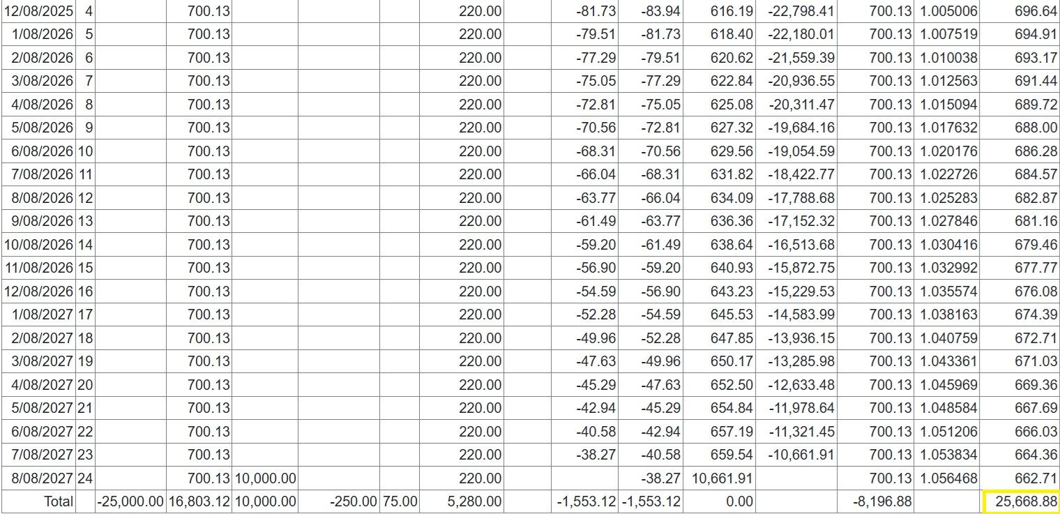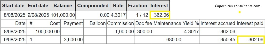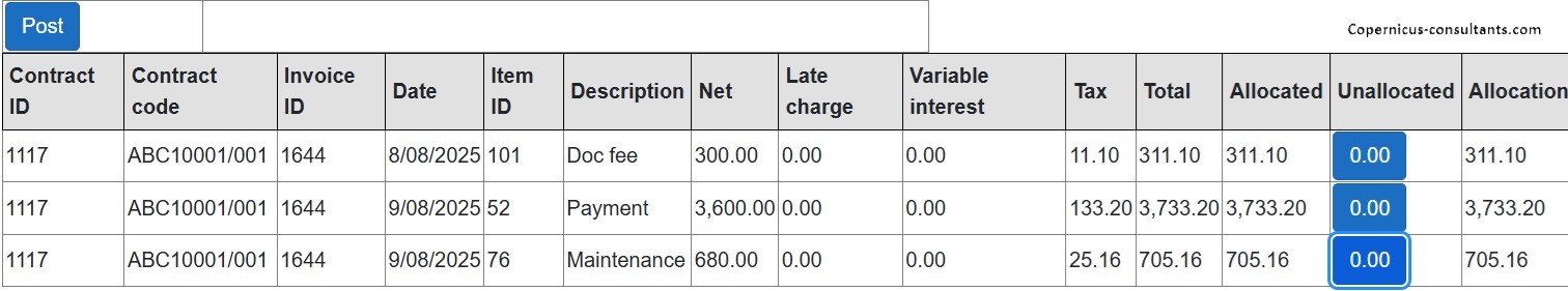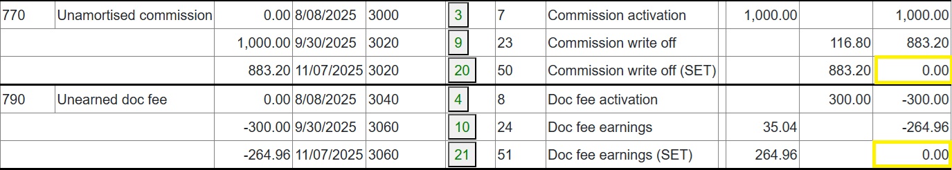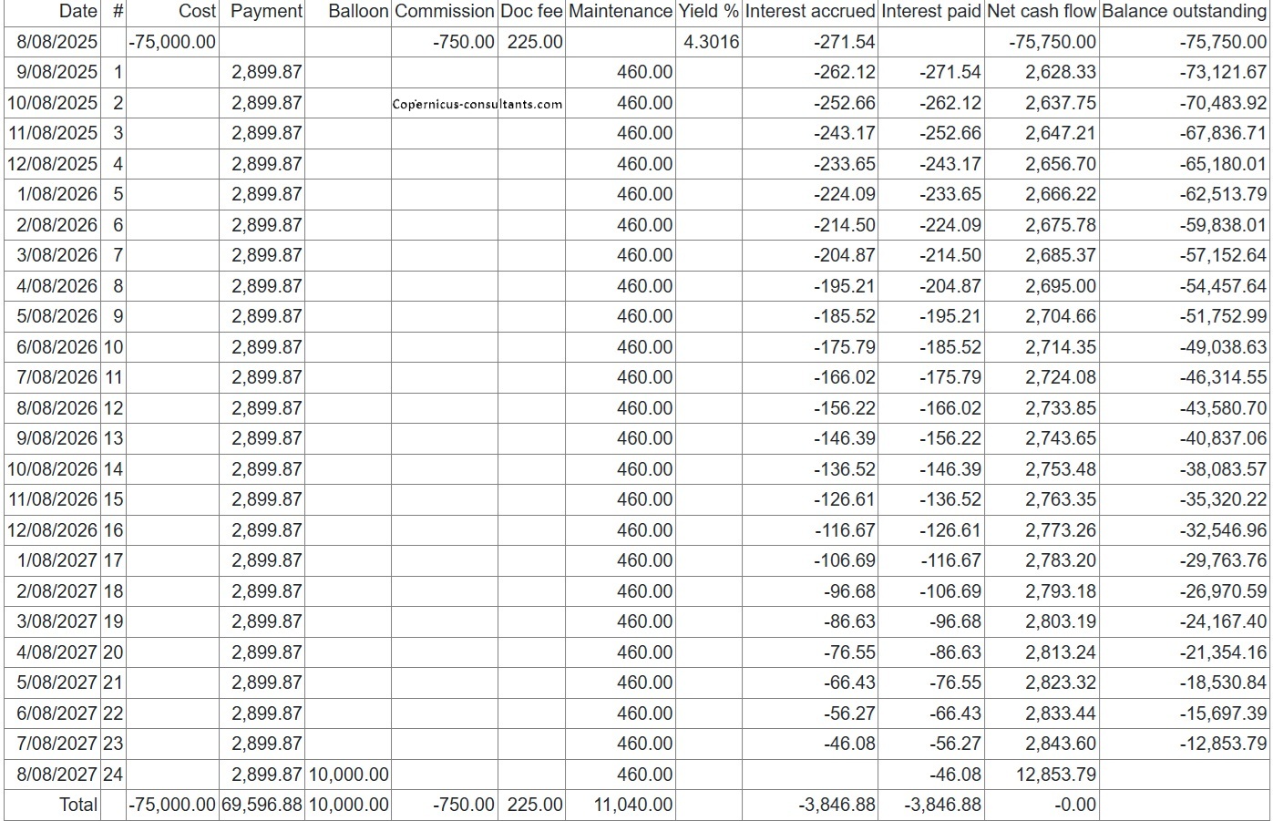 Full and partial settlements (payoffs). Copernicus enables a Quote (with expiry date) and Process (within expiry date) approach to settlements. Settlements can also be reversed using the “Undo” option. Below is a detailed example of a partial settlement. It is based on 4 assets each costing 25,000 with balloons of 5,000, 5,000, 0 and 10,000. As you can see the balloons are not simply a prorata of the total baloon of 20,000 for assets 3 and 4. if we settle one of the first 2 assets then we would expect the payment reduction to be 25% of the total payment of 3,600. This is how the Trial Balance (TB) looks after processing Aug and Sep 2025