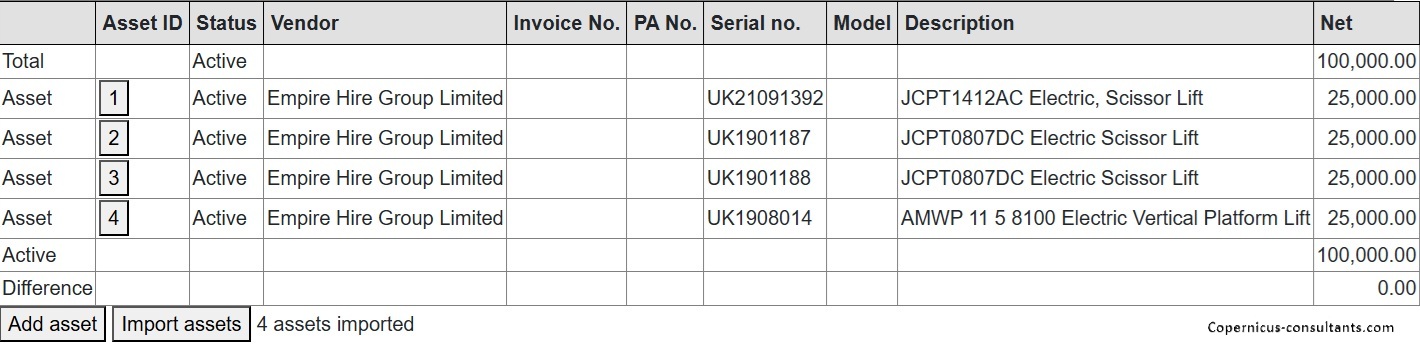 Unlimited number of contracts each with any number of assets. Assets can be transferred from one contract to another and also into stock for refurbishment before sale or onward lease