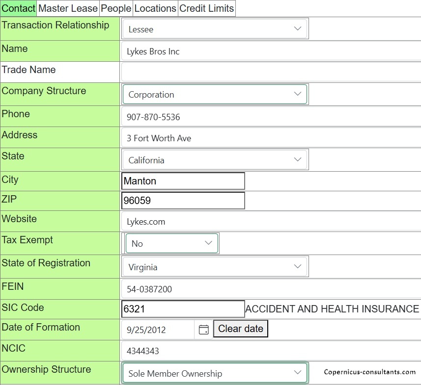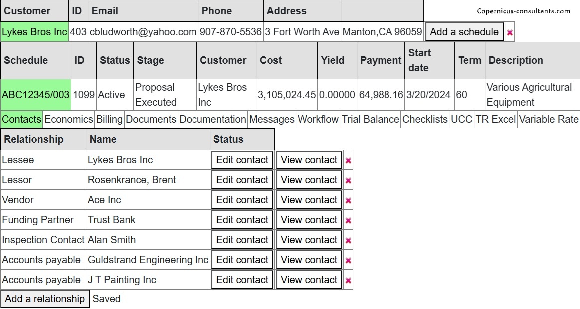 Each customer may (optionally) have one or more master leases. Each schedule then sits under a master lease and abides by the general terms of the ML. Schedules are coded, for example, ABC12345/001, /002 etc