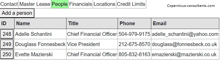 Sophisticated CRM contacts database (customers, suppliers, brokers, funders etc). Companies and individuals are “contacts” and may have different roles in different proposals and contracts. Here is an example of a list of contacts for a contract