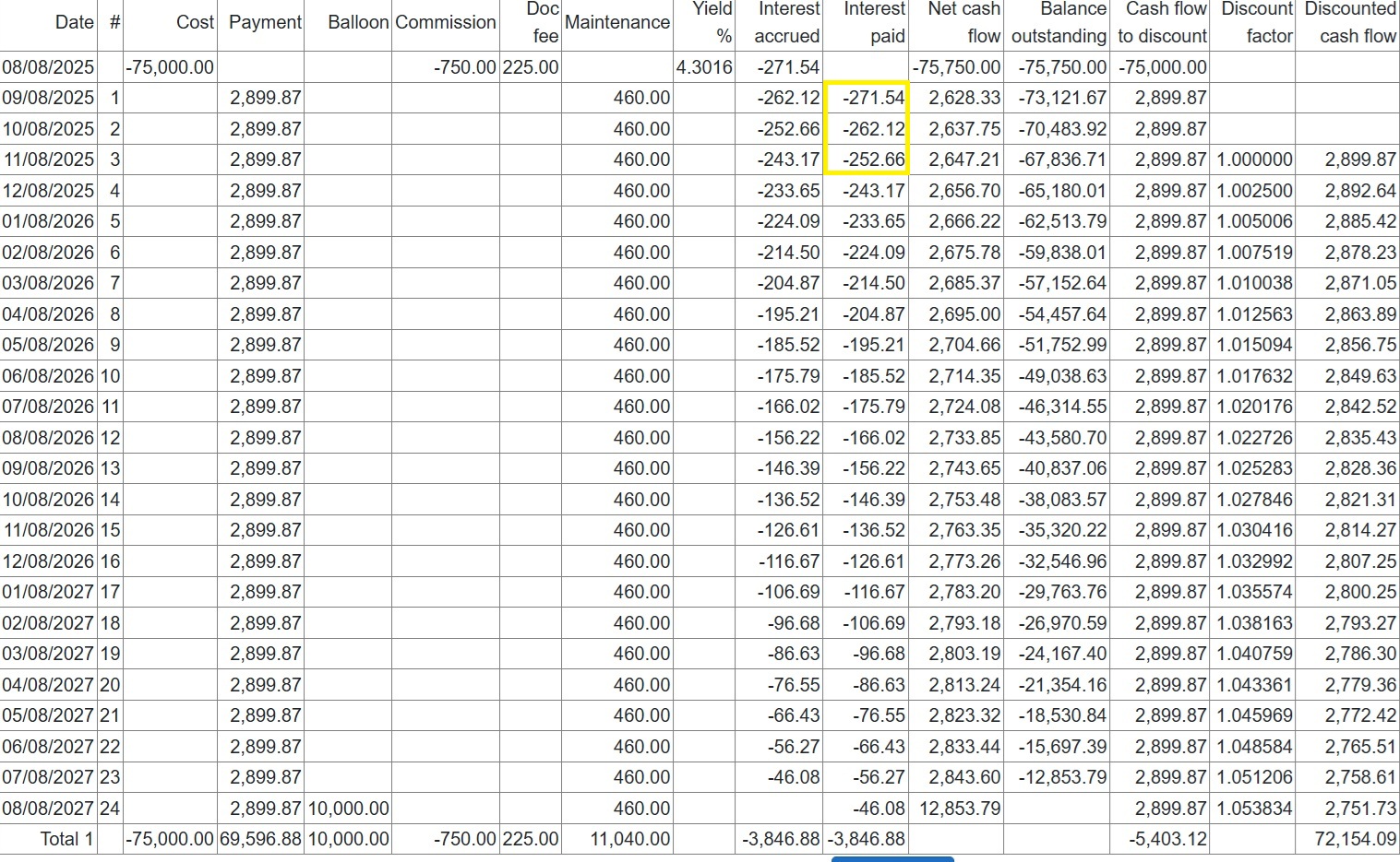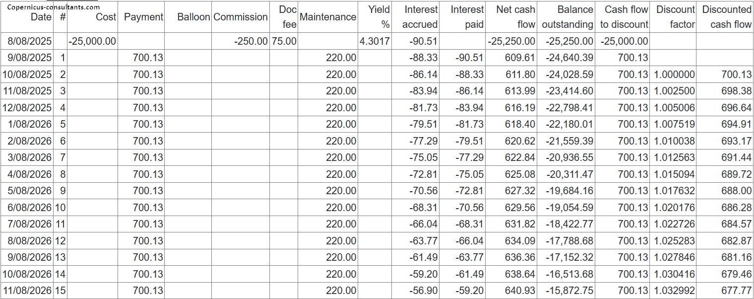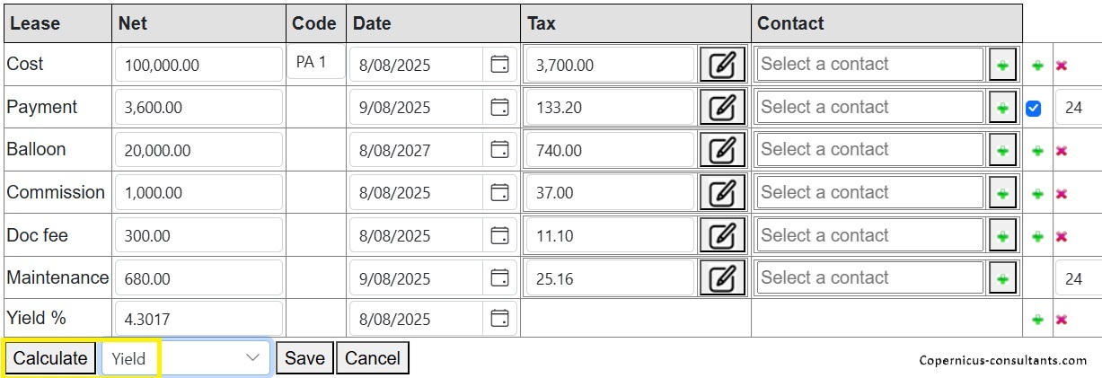 Variable rate adjustments are optional with a range of calculation options and an unlimited number of interest rate series. For example, interest rates may be retrieved automatically on payment dates (rollovers) or every 30, 60 or 90 days with optional business day and end of month adjustments. In the following example we will use a cost of 100,000 and 24 payments in arrears of 4,500 which gives rise to a Yield of 7.5009%.
