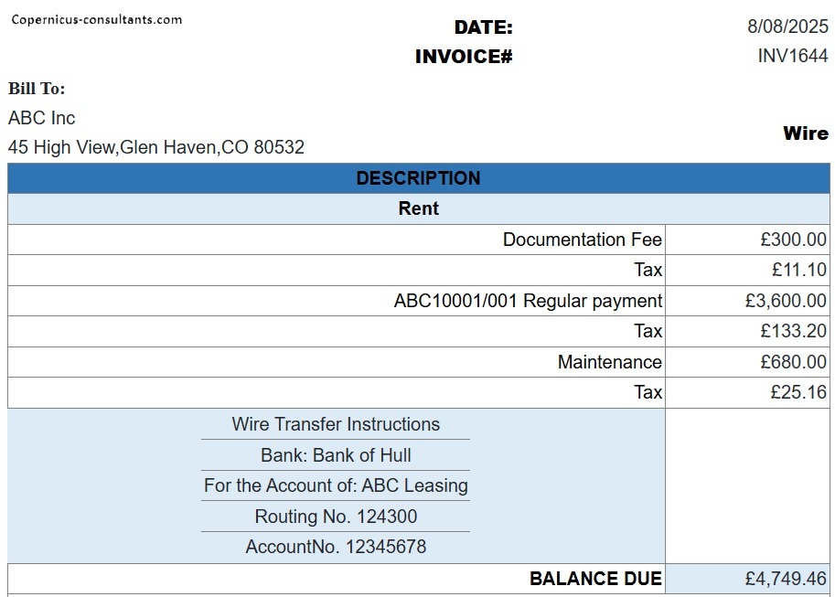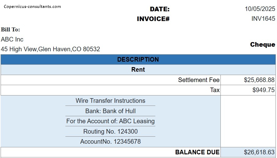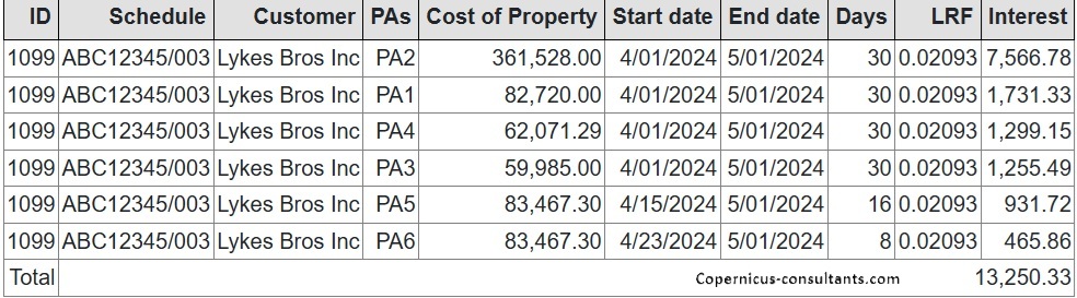 Interest progress payments are calculated automatically based on Lease Rate Factors (LRF) or a yield during a build out period. For example, the lessee progress payments might be calculated using a LRF whereas paymnents to funders are most likely to be based on a yield %. Here is an example of a lessee progress interest invoice