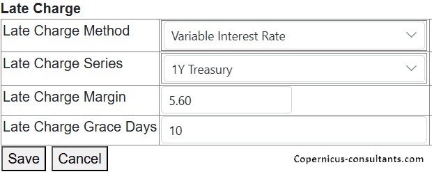 Late payment charges based on either a fixed charge or a fixed or variable rate of interest on the amount outstanding. Here is an example of the late charge input screen