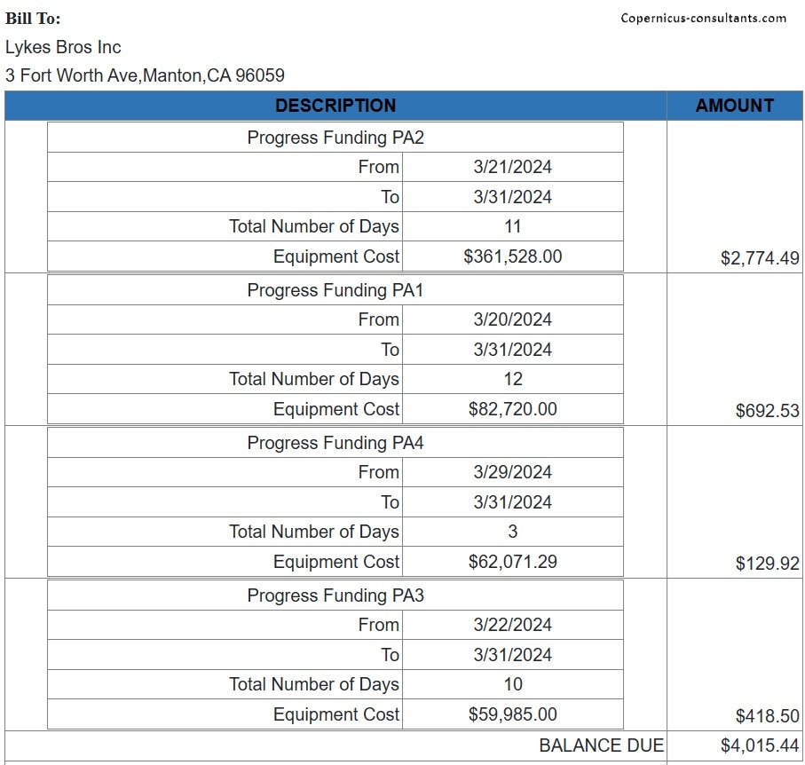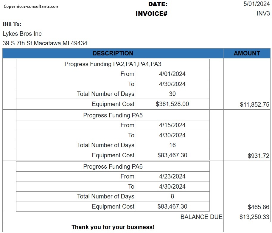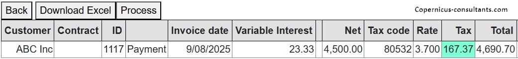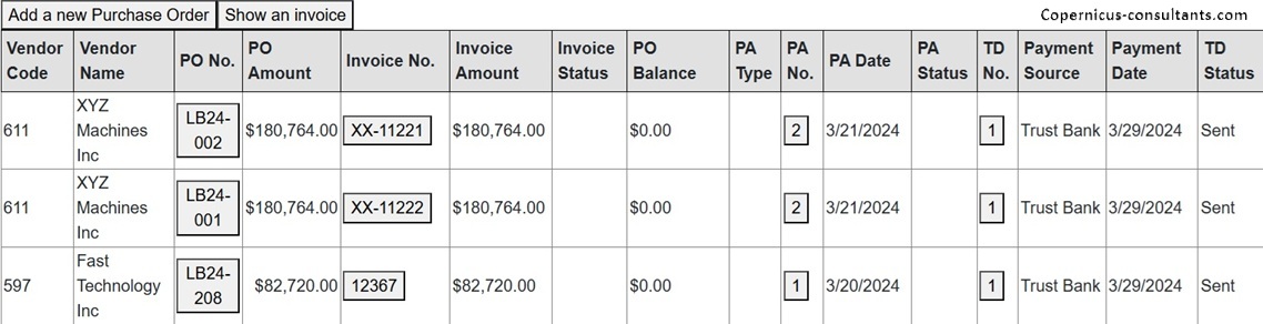 Copernicus enables Purchase Orders to be managed and matched to Invoices Received. When and invoice is approved to pay then progress interest starts and the customer receives his first progress interest invoice. When funded (which might be a different date) the funder starts being paid. Here is an example of how this looks in Copernicus