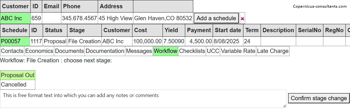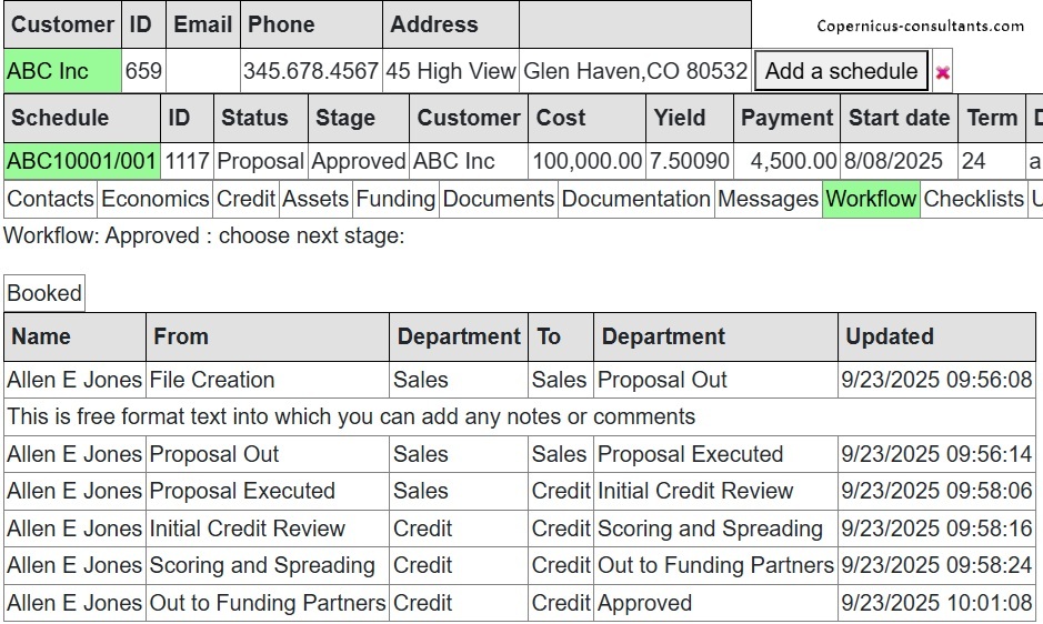 Fully user defined by process (proposals, collections, repairs and so on). Workflow can have multiple routes depending on, for example, amount financed or type of business. Routes can be repeated until completed or cancelled. There is a full audit trail of user and timestamp and comments made as a proposal moves through the workflow.